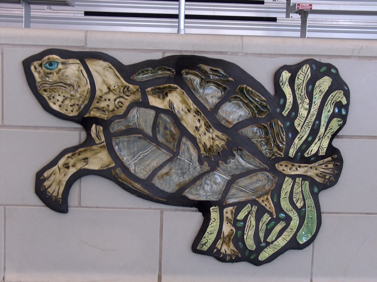 Ceramic mosaic mural made with community involvment. Both in making the handmade tiles and Installation.